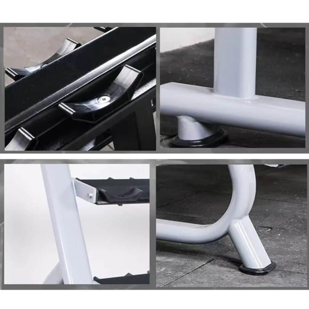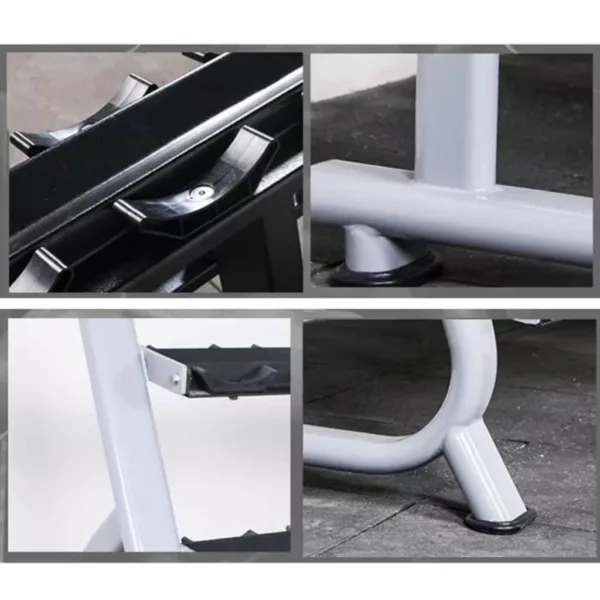 This very heavy-duty Lee Warehouse 15-Pair dumbbell rack is commercial quality. Our saddle-style dumbbell racks have tiers that were biomechanically designed to make loading and unloading your dumbbells safer and less labor-intensive. They have no sharp edges to damage your dumbbells. Your dumbbells are safer and less labor-intensive. The heavy-duty rack has matte steel frames to safely store heavy commercial dumbbells. The horizontal supports have a hardened rubber saddle to protect the dumbbells when they are re-racked. This Dumbbell Rack holds both the Round Dumbbell Set and the Hex Dumbbell Set.