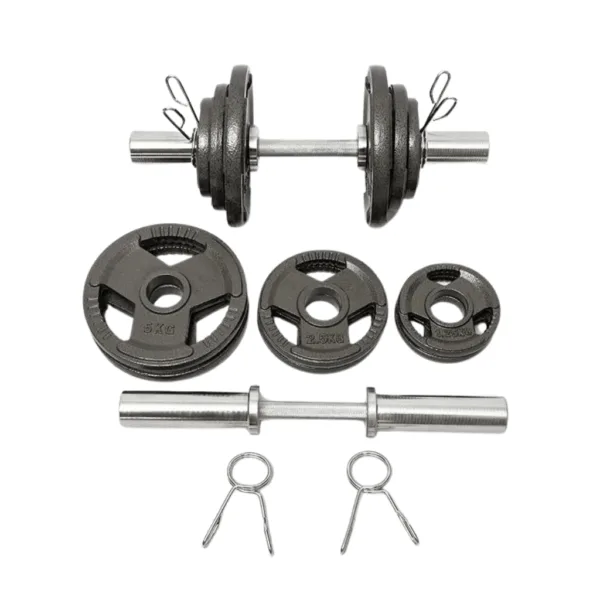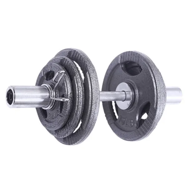 Introducing our heavy-duty iron Olympic Dumbbell Set! This premium fitness equipment is built with robust materials for durability and comes with four lockers to keep your weights organized. The set includes two bars, each weighing around 8kg, and is brand new in the box. The 50cm length and 15cm handgrip provide a comfortable grip during workouts. The weights holding parts measure approximately 16cm on each side, accommodating Olympic-sized weights with a 5cm hole. With a load rating of 180kg, this set offers ample room for progressive training.