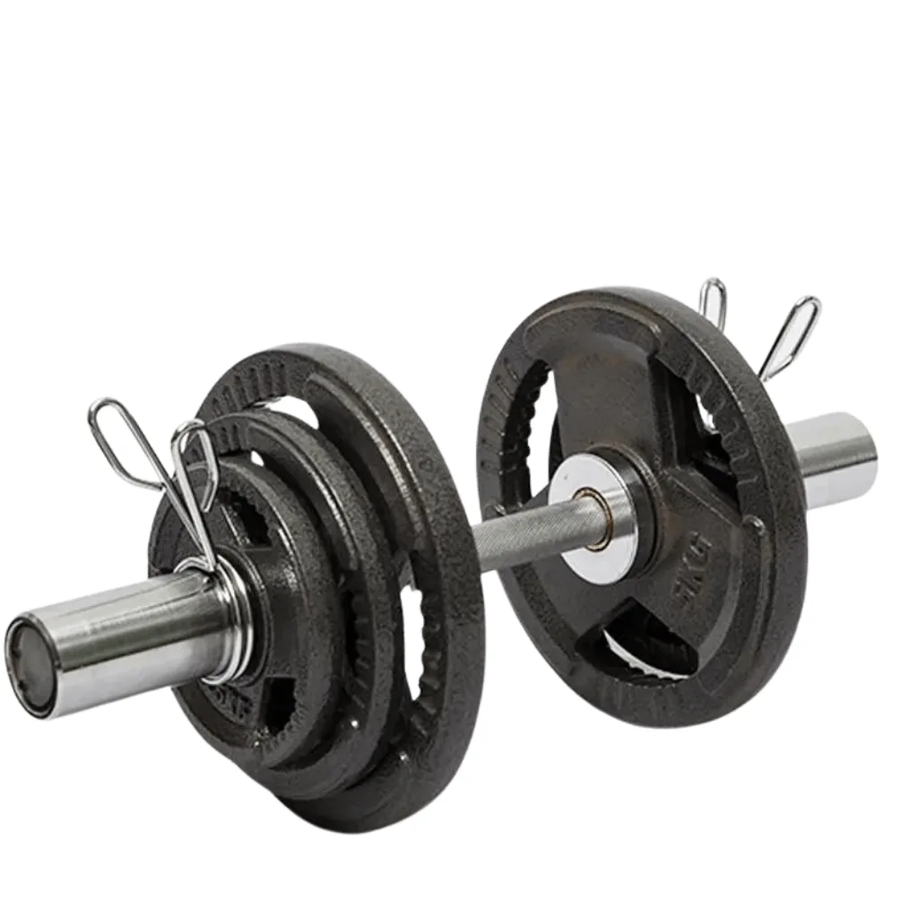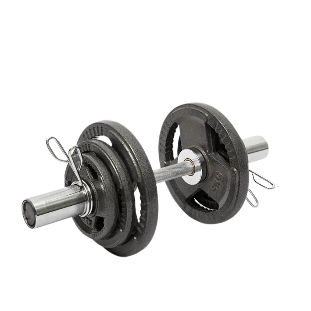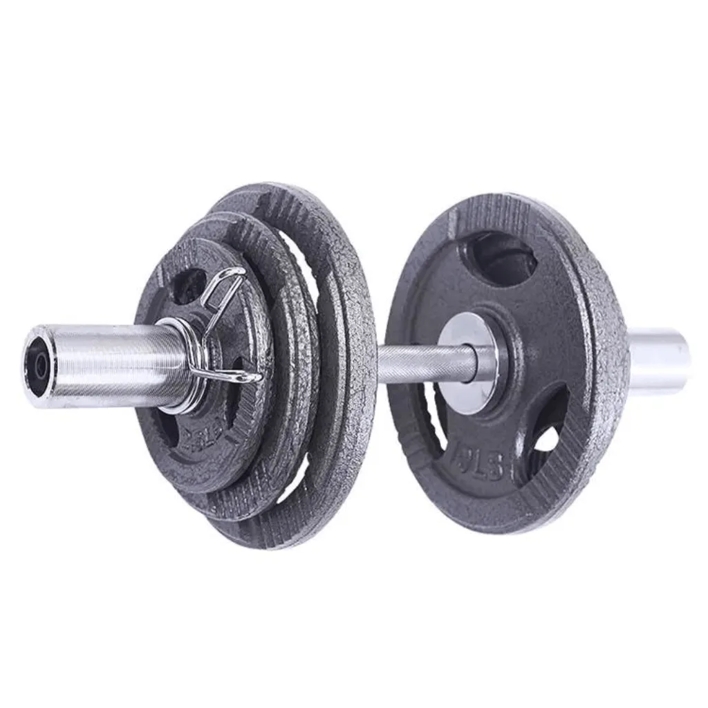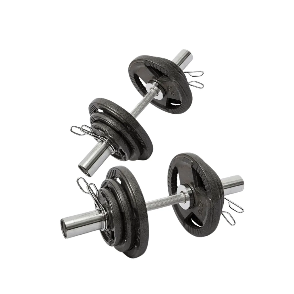 Introducing our heavy-duty iron Olympic Dumbbell Set! This premium fitness equipment is built with robust materials for durability and comes with four lockers to keep your weights organized. The set includes two bars, each weighing around 8kg, and is brand new in the box. The 50cm length and 15cm handgrip provide a comfortable grip during workouts. The weights holding parts measure approximately 16cm on each side, accommodating Olympic-sized weights with a 5cm hole. With a load rating of 180kg, this set offers ample room for progressive training.