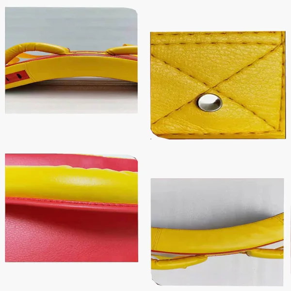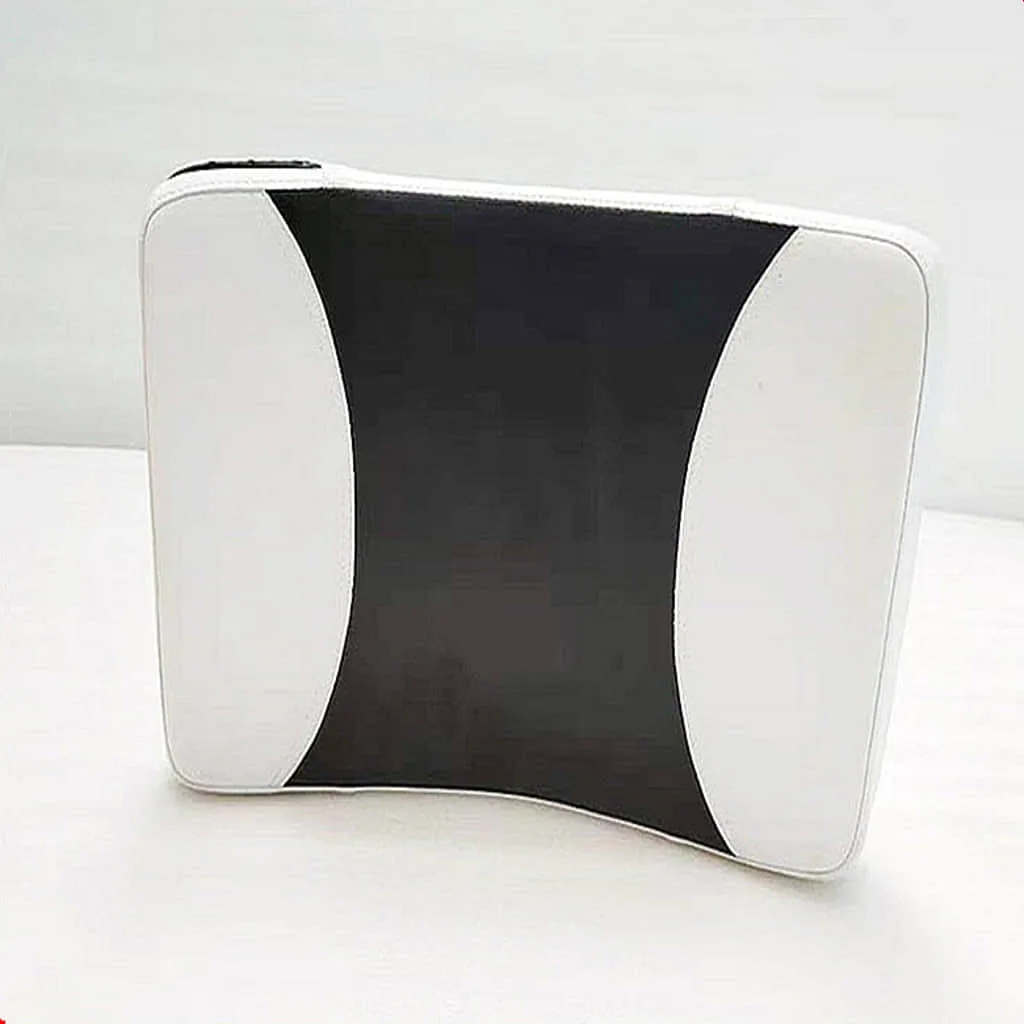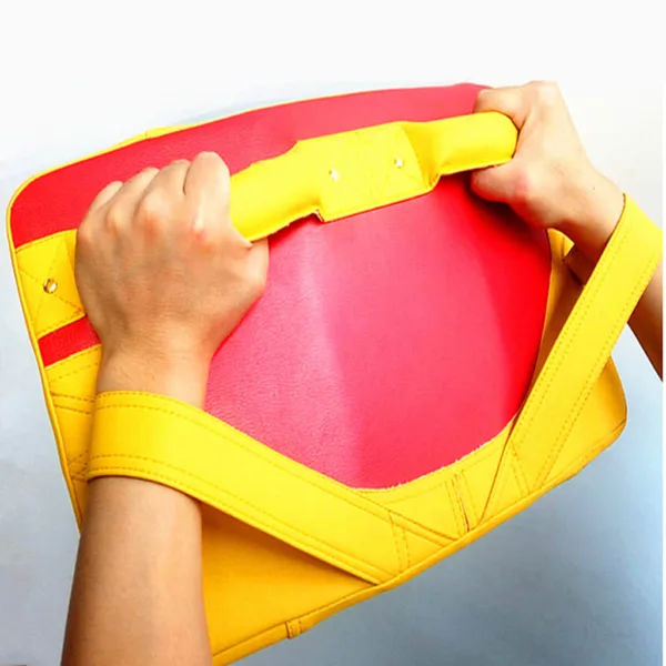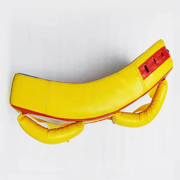 The double-hand curved strike shield is a training tool designed for kick training, specifically tailored for the fast and agile movements in Taekwondo. It features a slightly curved top surface, which optimizes impact absorption. The shield also includes air vents on the sides to prevent excessive pressure and protect the cushion from bursting.