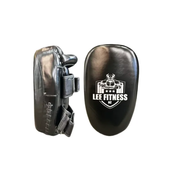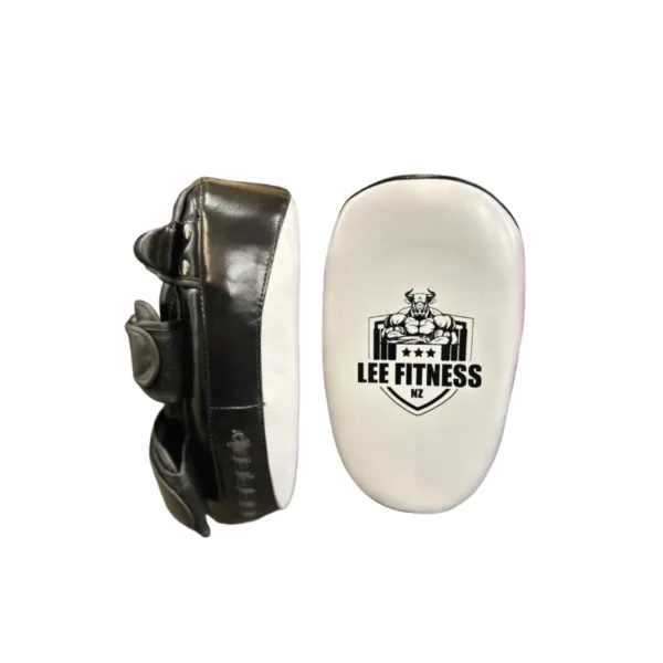 Lee Fitness curved boxing pads in blue, white, red, and black, designed for strike training and precision workouts.