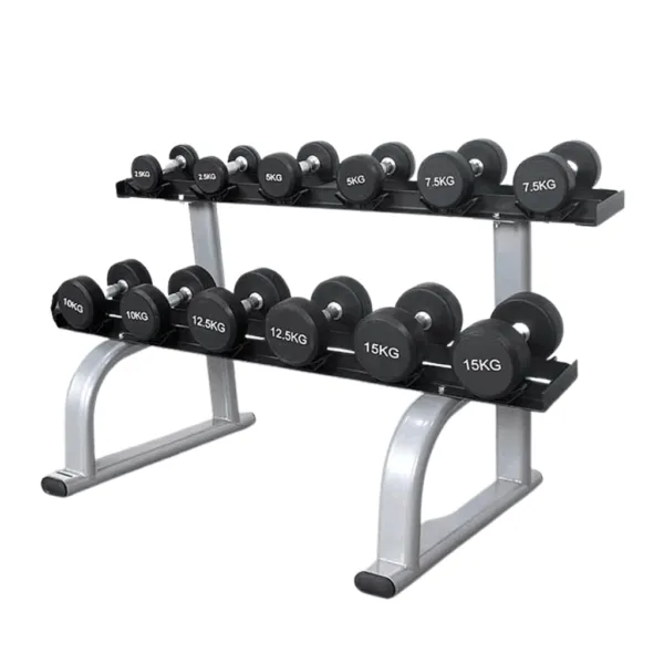 - The heavy-duty rack is designed for heavy commercial dumbbells.