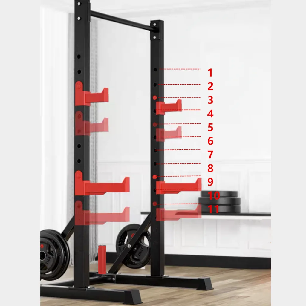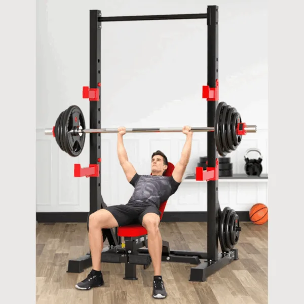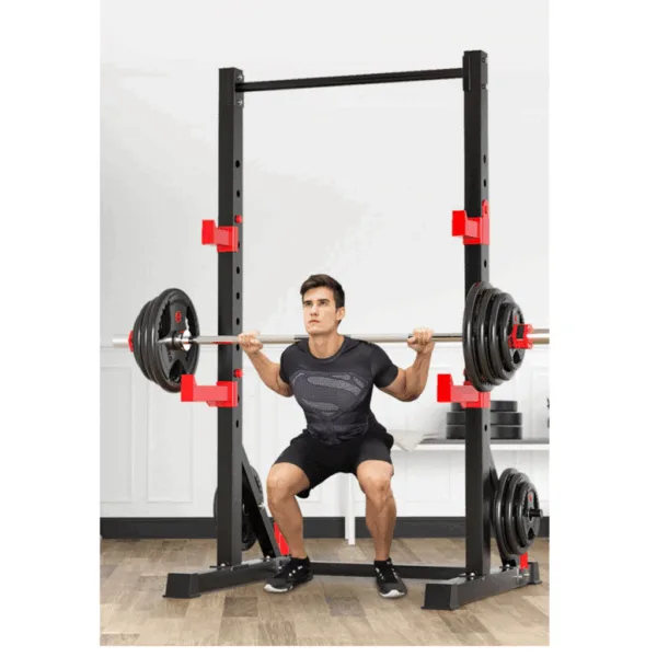Half Squat rack: It is the best choice for your home gym, and you can set up your fitness with this simple rack. This multi-press rack is perfect for developing your upper and lower body with pull-ups, press exercises, and squats. With multi-position height adjustment bar holders, you can easily find the right height to exercise safely. Besides, this rack won’t take up too much space in your home, and you can also easily add more weights or bench later on. It will fit all the ground.