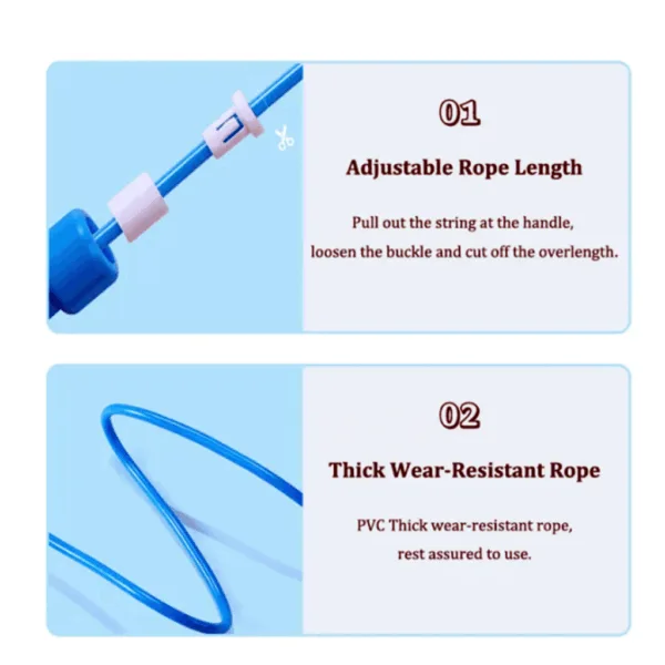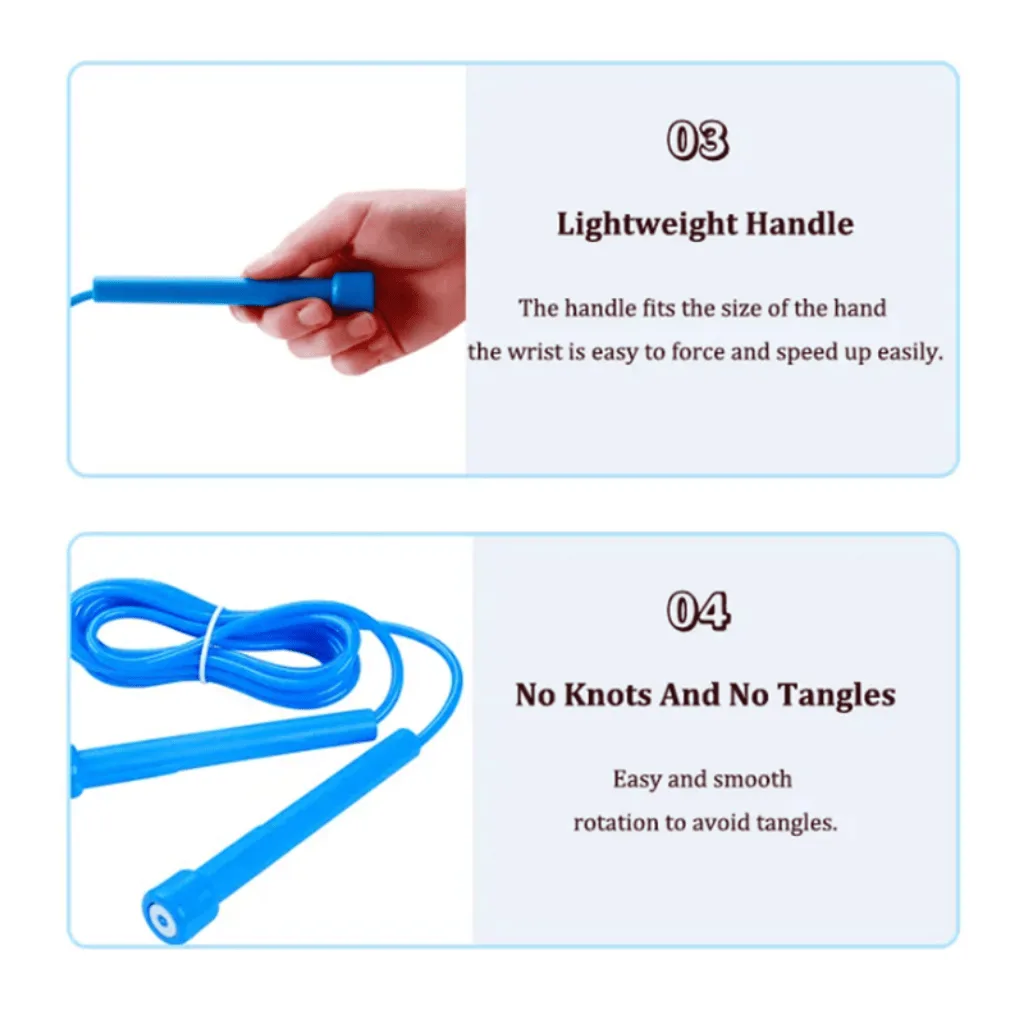 This jump rope allows for easy customization of the length to suit individual preferences. It is designed for speed skipping, providing a fast and efficient cardio workout. The length can be adjusted freely, allowing users to find their optimal rope length for comfortable and effective skipping exercises. With its adjustable feature, users of different heights and skill levels can enjoy a personalized skipping experience. The jump rope is designed to promote speed and agility while improving cardiovascular endurance. It is a compact and lightweight fitness tool that can be easily taken anywhere for a quick and effective workout.