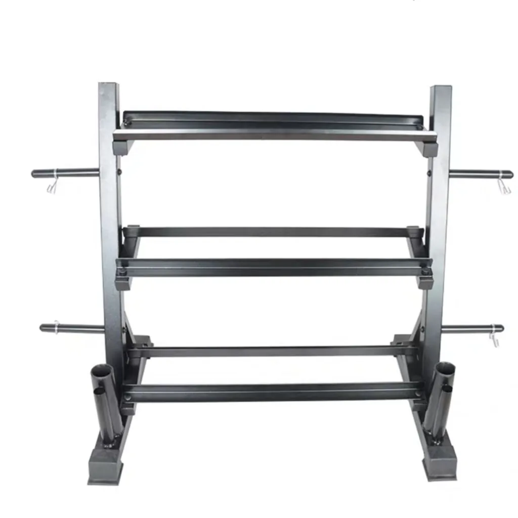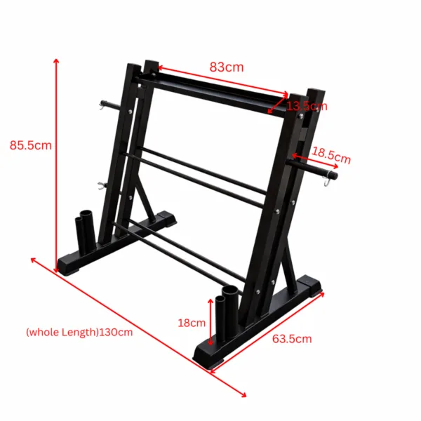 This multifunctional storage rack is designed to keep your home gym organized and space-efficient. The top tier comfortably holds 4–5 kettlebells (approximately 1–12kg), while the second and third tiers are ideal for storing dumbbells. On both sides of the rack, four integrated plate pegs allow for standard-size weight plates and come pre-equipped with four standard collars for secure storage. At the base, two large and two small vertical holders are designed to store barbells upright. By accommodating kettlebells, dumbbells, weight plates, and barbells in one compact unit, this all-in-one storage solution maximizes space efficiency and makes an excellent choice for home gyms.