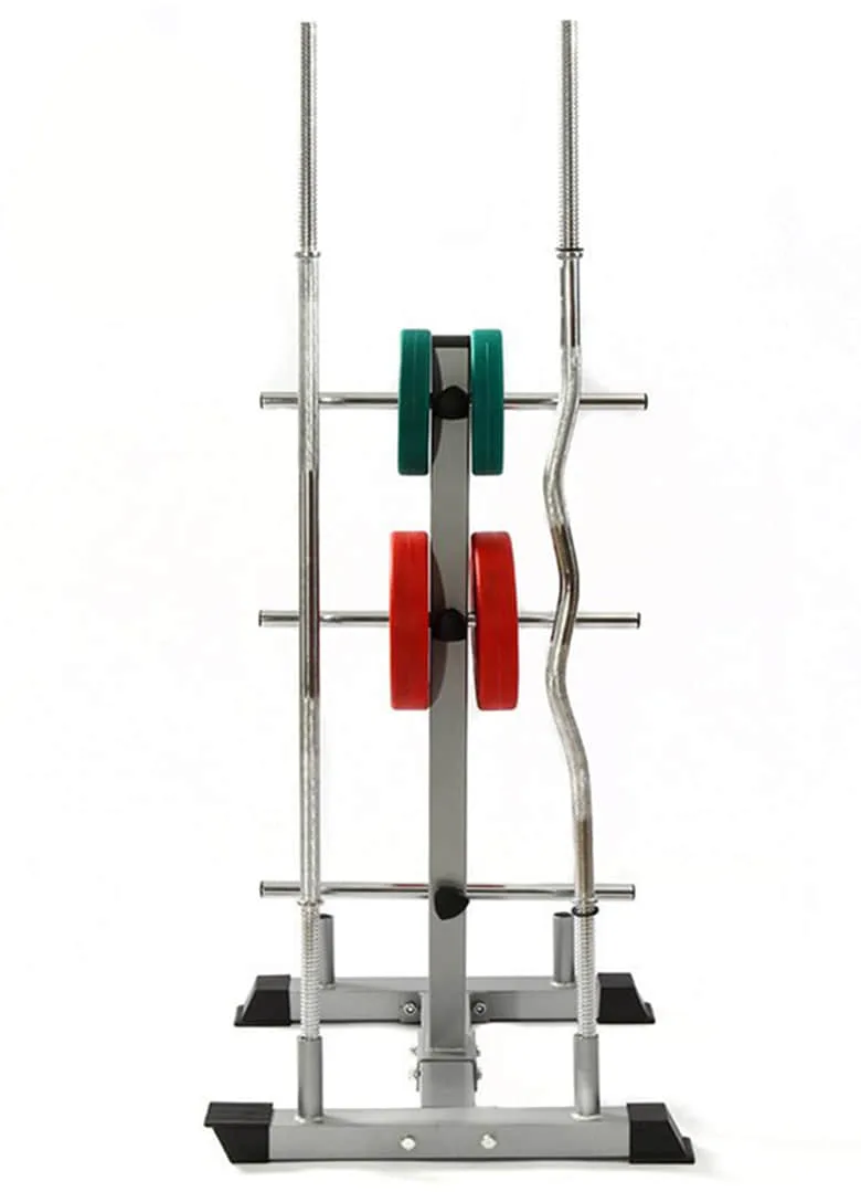 This multifunctional storage rack features three dedicated tiers for dumbbell storage, with four side-mounted pegs designed to hold standard-size weight plates and comes equipped with four matching standard collars. At the base, two large and two small vertical holders securely store different types of barbells. Designed to accommodate three types of gym equipment in one compact unit, this all-in-one storage solution maximizes space efficiency and keeps your training area clean and organized, making it an ideal and highly satisfying choice for home gyms.