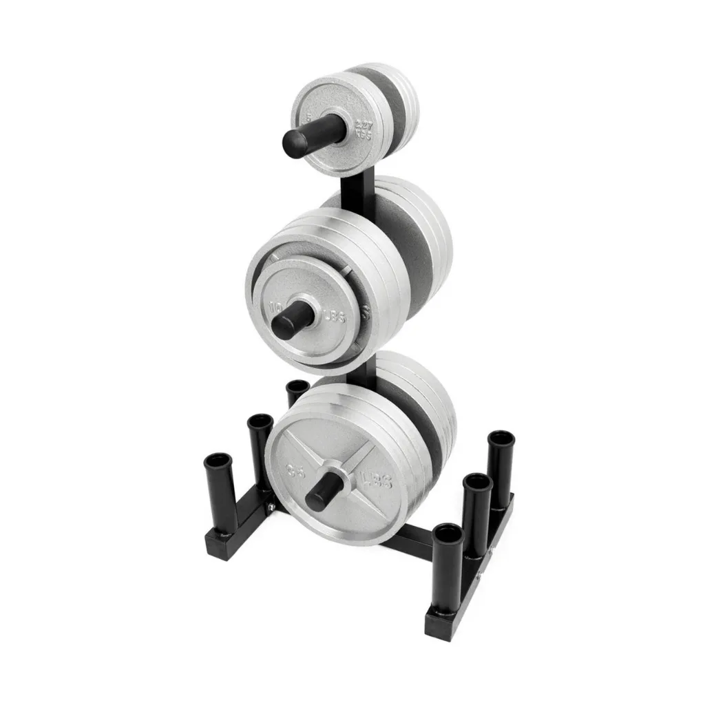 The Bumper Weight Tree is a convenient storage solution designed to store your weights and bars with ease. It is specifically designed to fit Olympic Bumper weight plates and Olympic bars. The bar holders can accommodate either four or two Olympic bars, providing flexibility in storage options. With three levels of Olympic bumper weight storage, you can keep your weights organized and easily accessible. The chrome-coated barbell hooks allow weights to slide on and off effortlessly, minimizing damage to the plates and the sleeve. The Bumper Weight Tree simplifies weight and bar storage, making it convenient and hassle-free for your workouts.