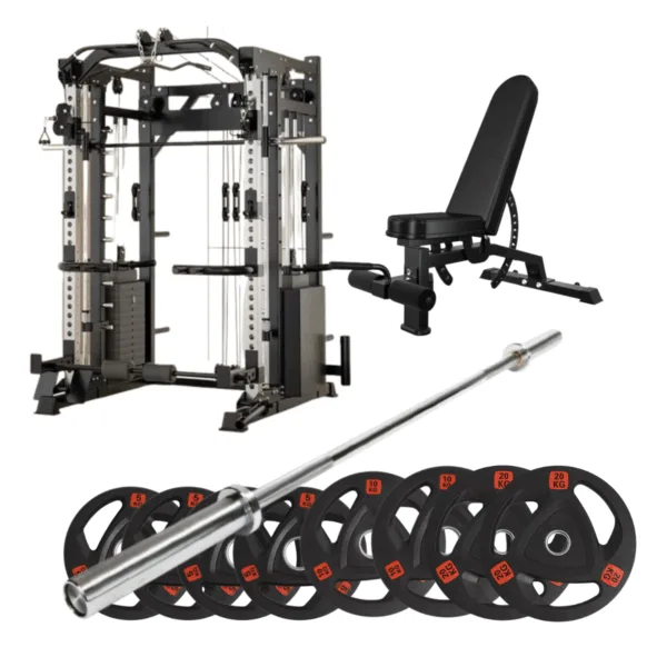 The Smith Machine Training Set is an all-in-one home gym solution designed for effective and convenient strength training. It includes a versatile Smith machine for a wide range of exercises, an adjustable bench to support various workout angles, 80kg of rubber-coated weight plates for safe and quiet lifting, and one 20kg olympic size barbell . This set offers everything needed for a complete, economical, and space-saving home workout setup.