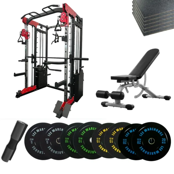 Smith machine gym package with adjustable bench, bumper plates, barbell, and floor mats.