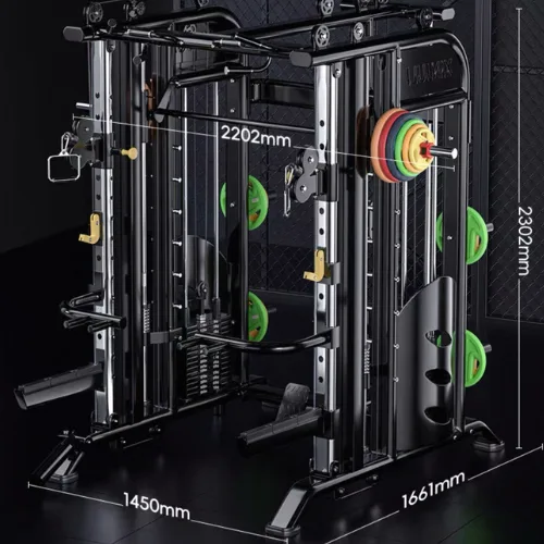 The half commercial Smith power squat rack is now available at Lee Warehouse. This flexible piece of equipment combines a variety of workouts into a single compact machine, making it the perfect all-in-one trainer. This cage provides a complete exercise solution by combining a functional trainer with a counter-balanced commercial Smith barbell and includes a squat rack. The commercial Smith power squat rack is intended to meet various fitness requirements. It enables users to execute bench presses, shoulder presses, squats, lunges, rows, and other activities. It provides a complete training experience that stimulates multiple muscle groups and enhances overall strength and fitness due to its multi-functional qualities. The commercial Smith power squat rack, available at Lee Warehouse, is a versatile and practical option for strength training and general health, whether for home or business usage.