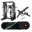 Introducing the ultimate Lee Warehouse home gym set, featuring a comprehensive package that includes a Smith machine, an adjustable bench, an Olympic 500lb barbell without bearing and a set of weights. This meticulously designed Smith Machine is the epitome of perfection for your home gym. It includes a full-frame power cage, an adjustable pulley system, a chest pull-up/chin-up bar, a solid safety bar for squatting, J hooks for squat training and bench press, dip bars, a landmine attachment, weights, and bar storage, a weights and bar storage rack.
