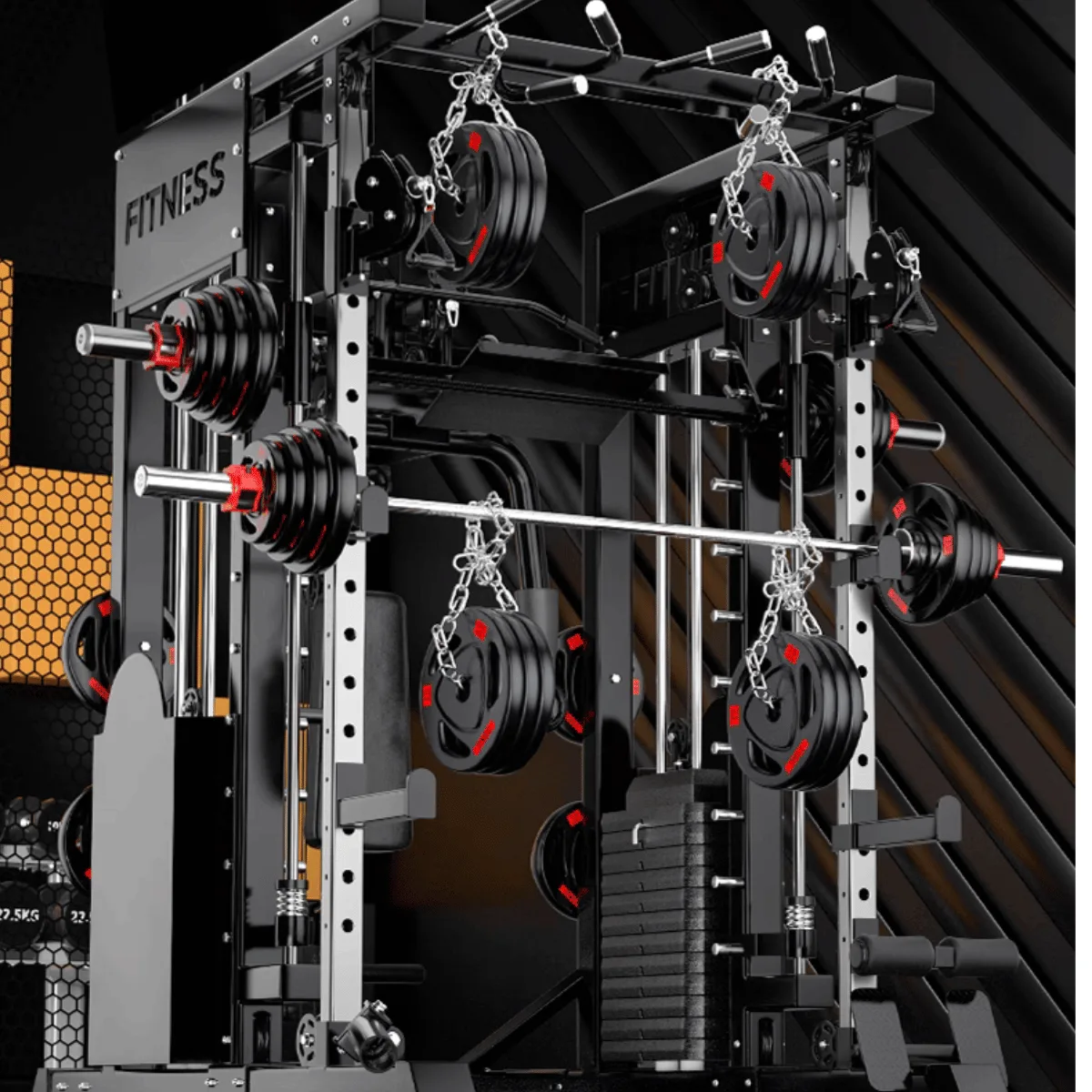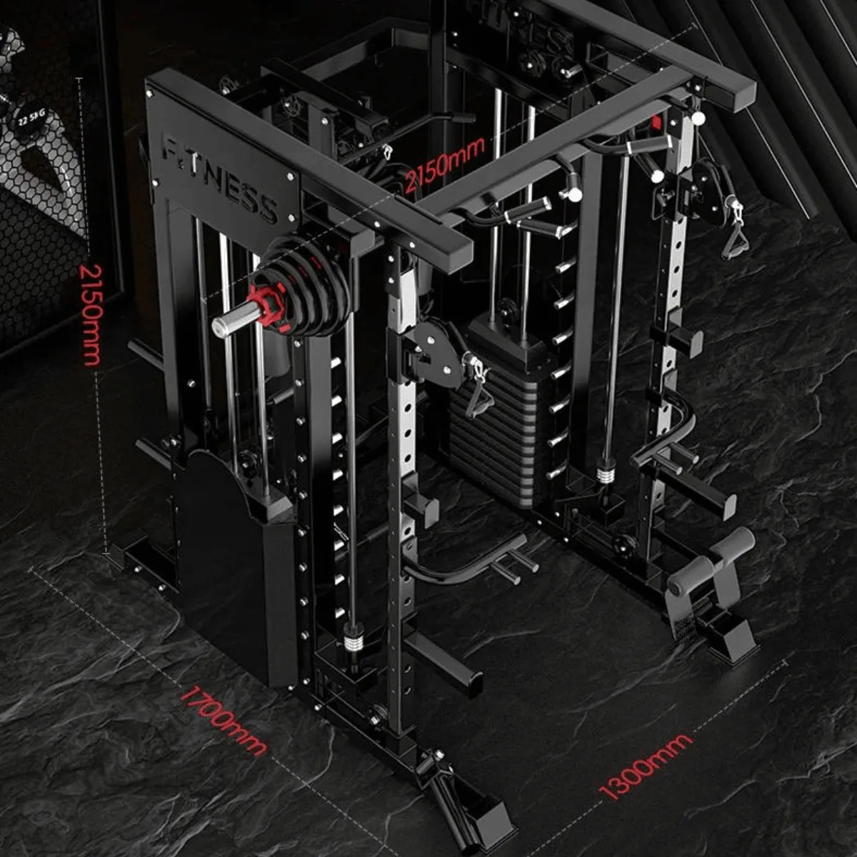 Introducing the ultimate Lee Warehouse home gym set, featuring a comprehensive package that includes a Smith machine, an adjustable bench, an Olympic 500lb barbell without bearing and a set of weights. This meticulously designed Smith Machine is the epitome of perfection for your home gym. It includes a full-frame power cage, an adjustable pulley system, a chest pull-up/chin-up bar, a solid safety bar for squatting, J hooks for squat training and bench press, dip bars, a landmine attachment, weights, and bar storage, a weights and bar storage rack.