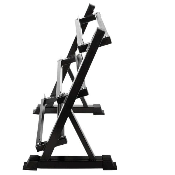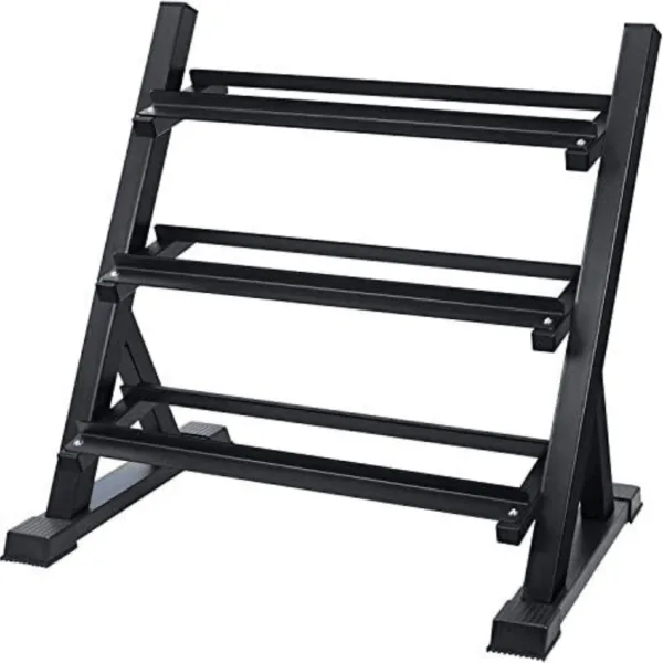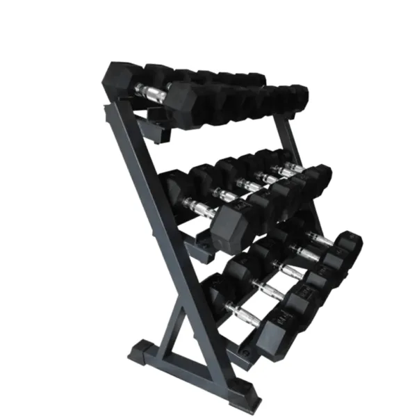 These racks are specifically designed to hold and display dumbbells in a neat and orderly manner. By using a dumbbell rack, you can keep your hex dumbbells off the floor and prevent them from rolling around or cluttering your workout space. The rack provides designated slots or shelves where you can place each dumbbell securely, ensuring they are easily accessible and ready for use. Not only does a dumbbell rack help maintain a clean and organized workout area, but it also extends the lifespan of your dumbbells. By keeping them off the ground, the dumbbell rack halps prevent scratches, dents, and other damage that could occur from being in contact with the floor.