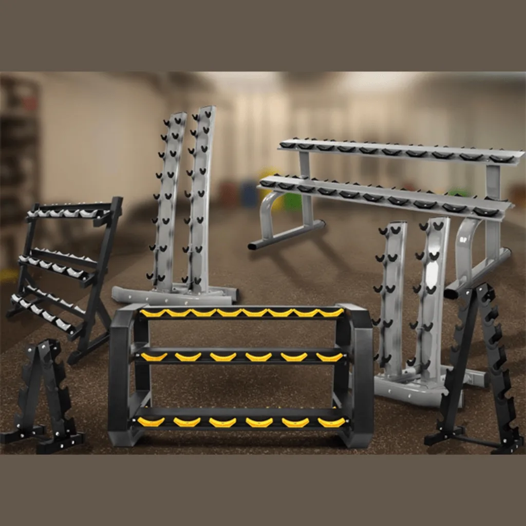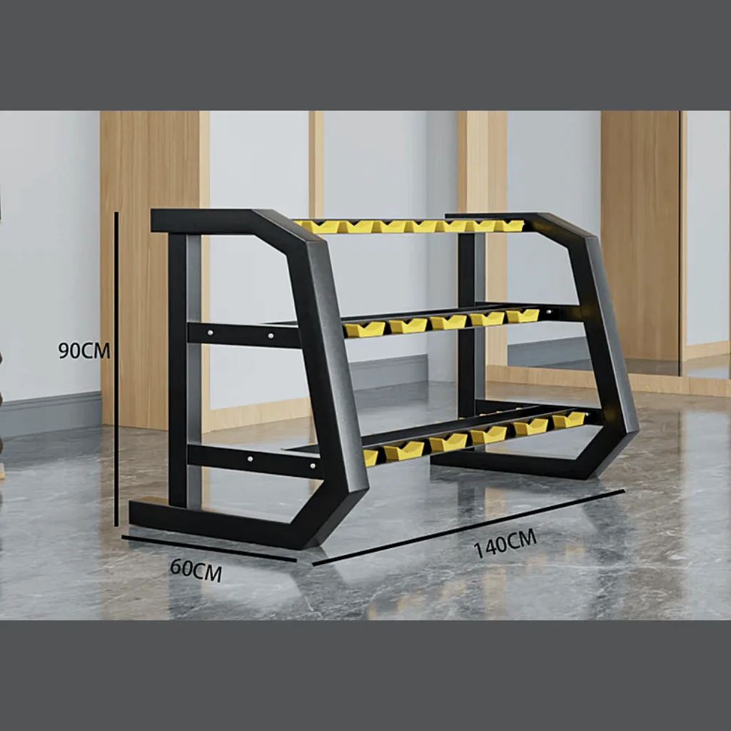 The dumbbell rack is designed to offer a tidy storage option for dumbbells, whether they are used at home or in a commercial gym. With its purposeful design and features, the rack helps in maintaining a neat and organized space. The dumbbell rack features a robust construction, built to withstand the demands of regular use in a home or commercial gym setting. Made from durable materials such as matte steel frames, it ensures long-lasting durability and stability. To protect the dumbbells and maintain their quality, the rack is equipped with horizontal supports that feature hardened rubber saddles. These saddles provide a cushioned resting place for the dumbbells, preventing any damage to their surfaces when they are placed on the rack.